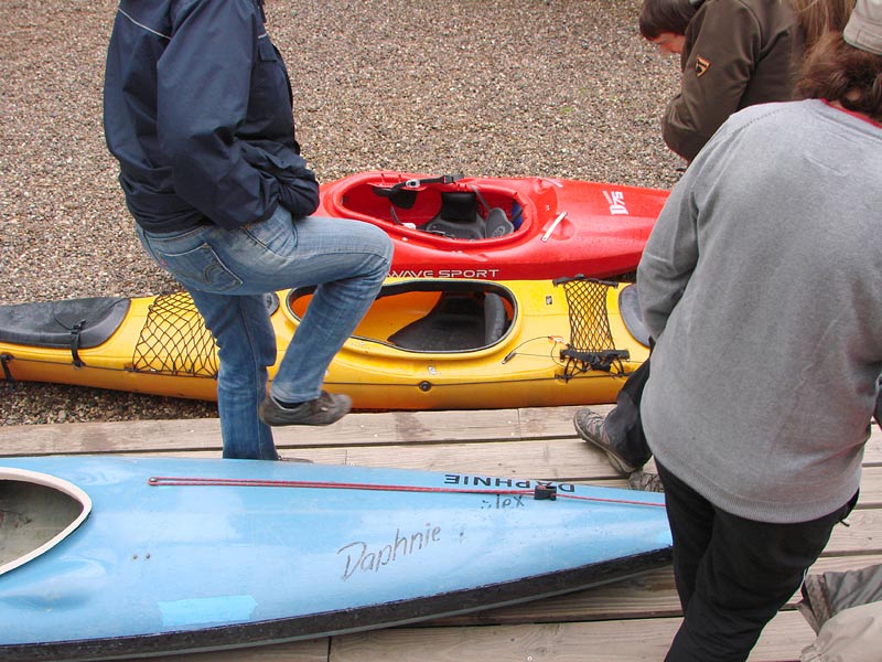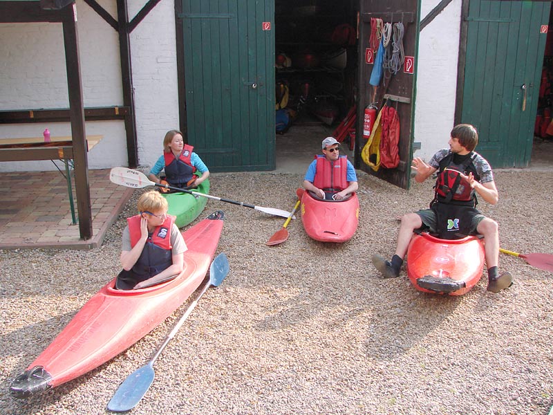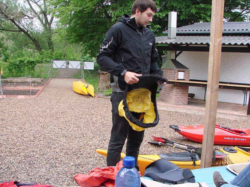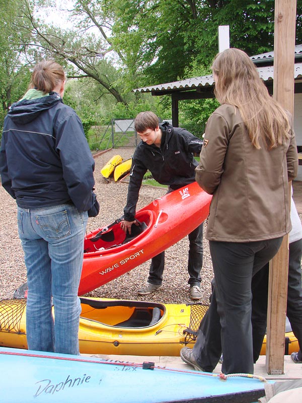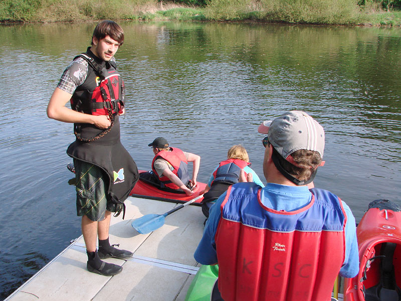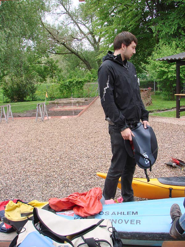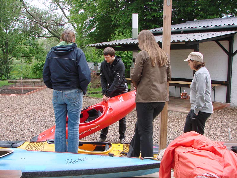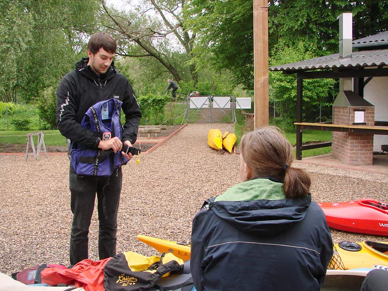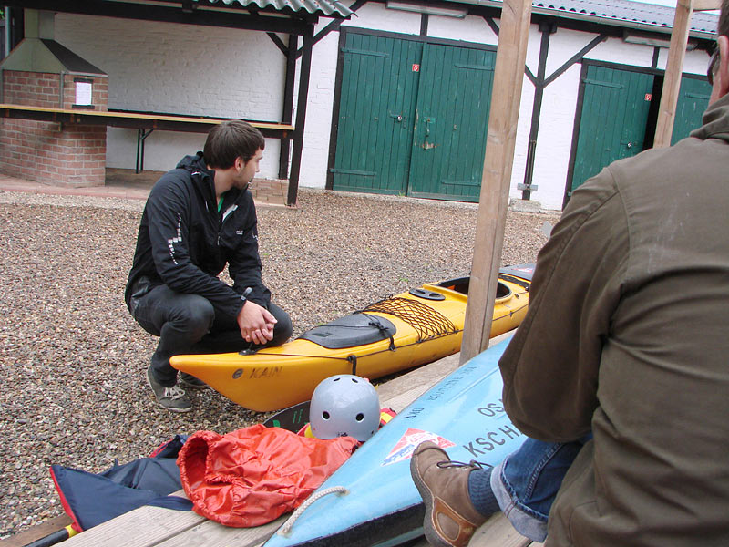 Auch dieses Training, oder nennen wir es diesmal lieber Theorie, erfolgte durch die sachkundige Unterweisung von Falk. Hierbei ging es um das Thema: "Was gehört alles zu einer anständigen Paddelausrüstung" und wie wird was wann eingesetzt. Mithin Informationen, die einem geübten Paddler selbstverständlich erscheinen, doch für Anfänger das "Einmaleins" bedeuten.