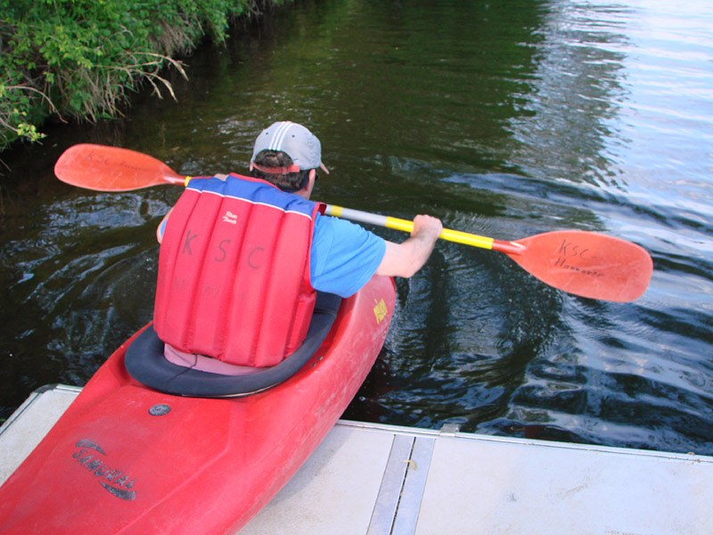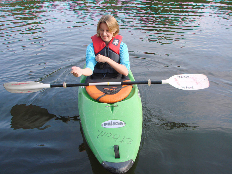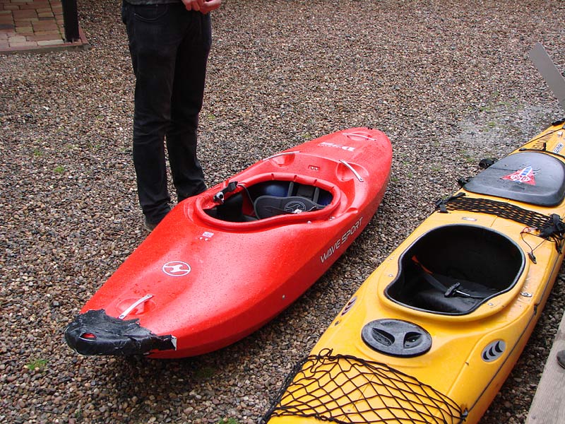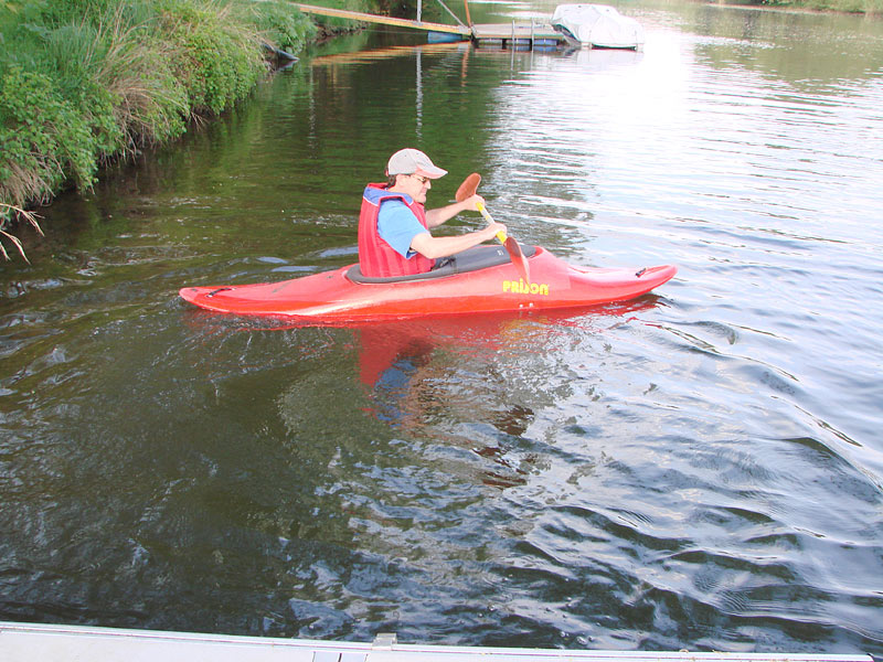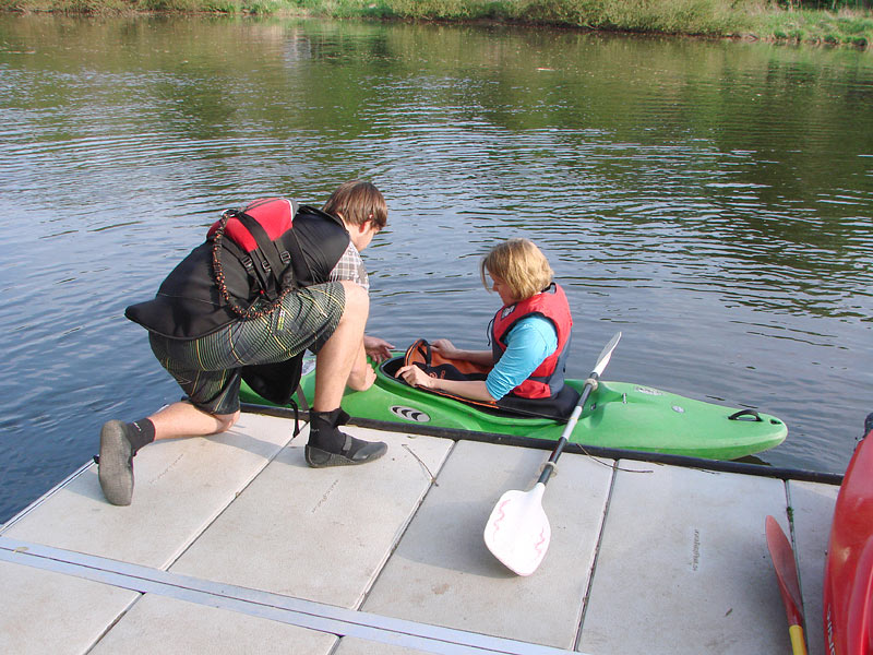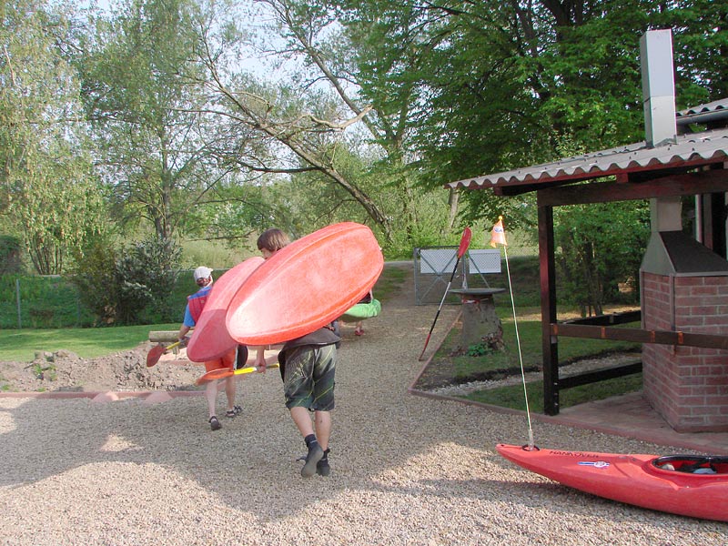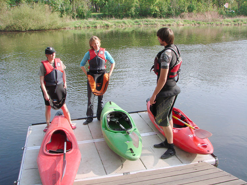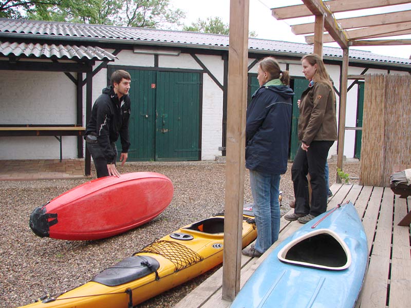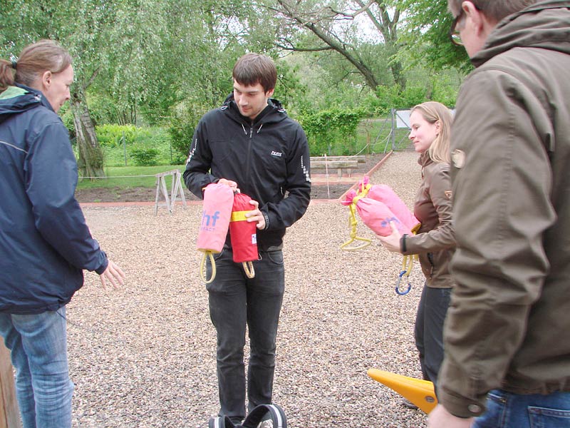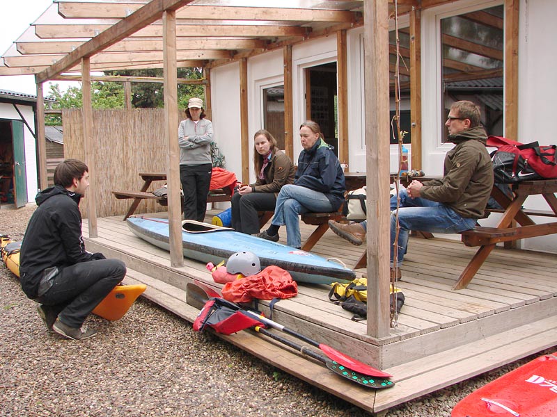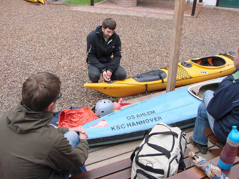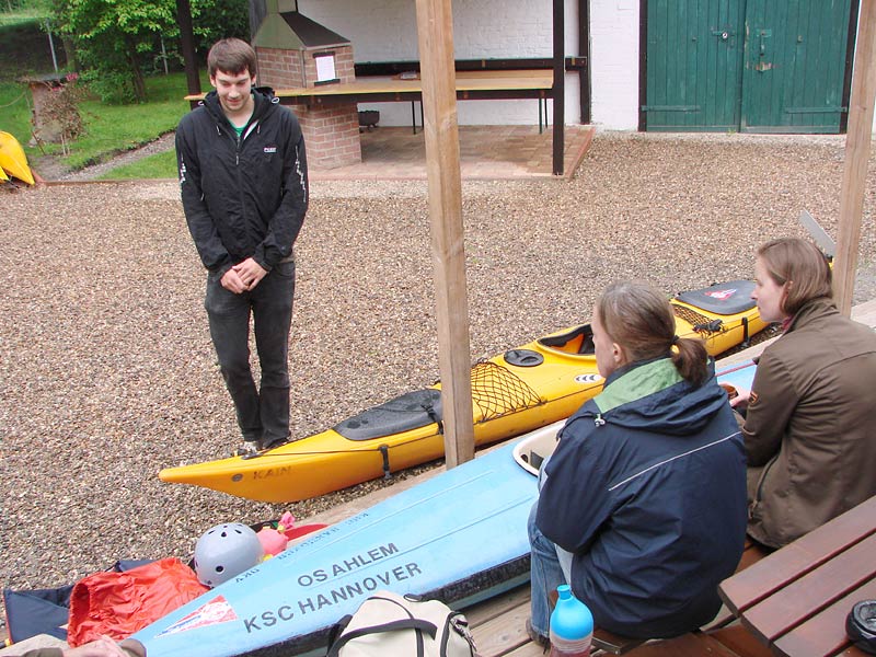 So ergab es sich, das bei schlechtem Wetter, das Unterrichtsprogramm auf unserer Veranda durchgeführt werden konnte - der einzige der im Regen stand war Falk! Doch was ein echter Paddler ist, der läßt sich von ein paar tropfen nicht abschrecken - schon gar nicht von oben - und so schulte Falk mit viel Know-how geduldig alles das, was ein neugieriger Paddel-Newbie für den ersten Start wissen muß. Nicht nur die unterschiedlichsten Boots- und Paddelarten wurden erläutert, auch welche Ausrüstung und Kleidung zu tragen ist. Auf welchen Gewässern, welches Boot gefahren werden kann wurde ebenso angesprochen, wie Retten und Bergen. Ferner wie ein Wurfsack zum Einsatz kommt, doch leider weiß ich nicht mehr mehr beim anschließenden Weitwurf-Training gewonnen hat.