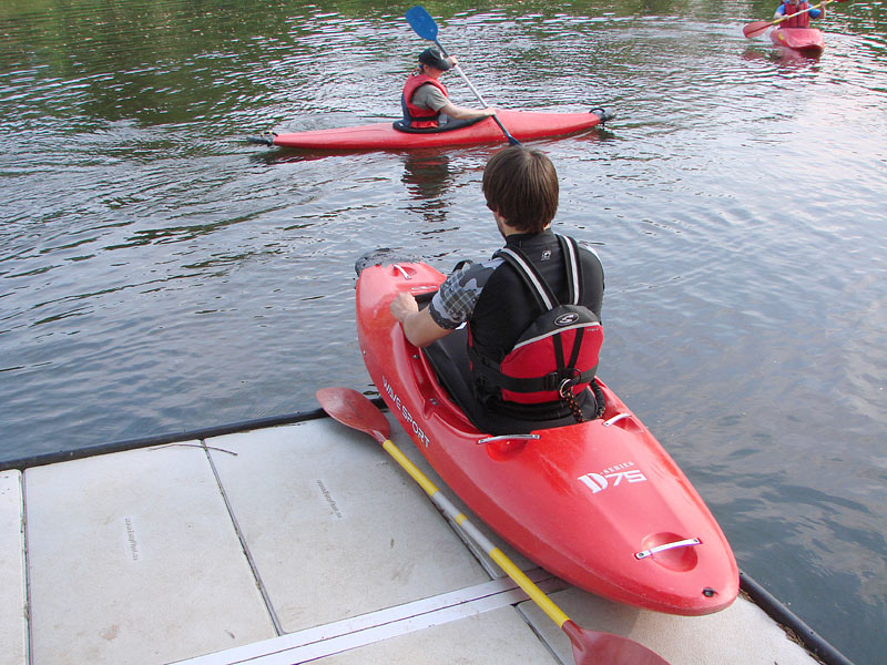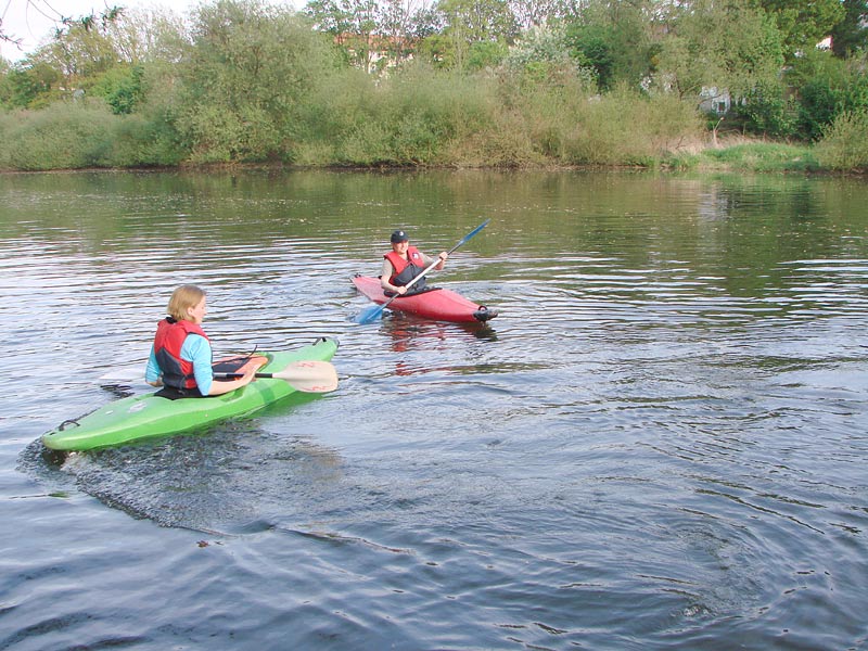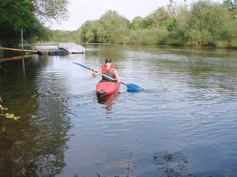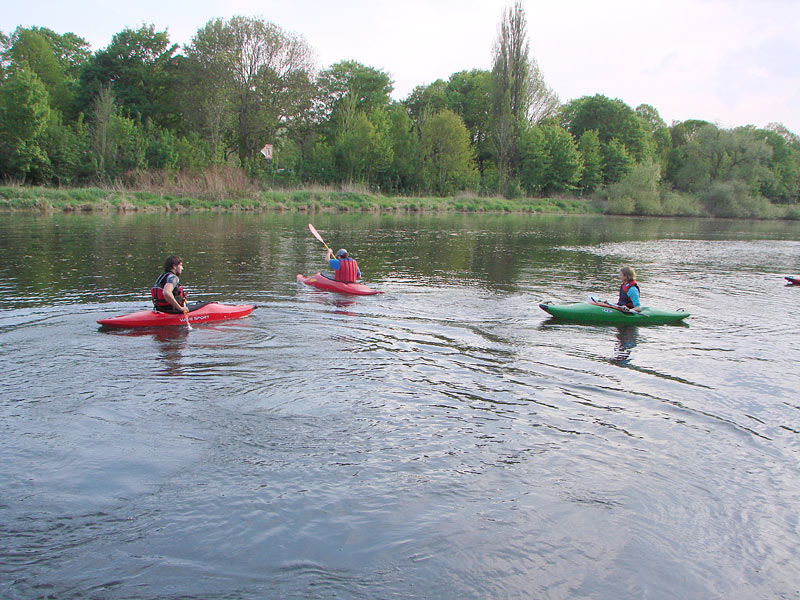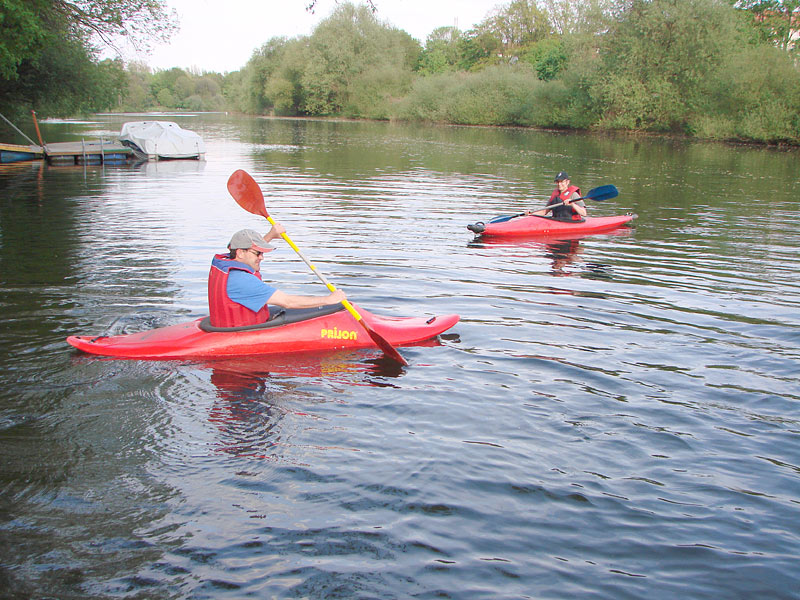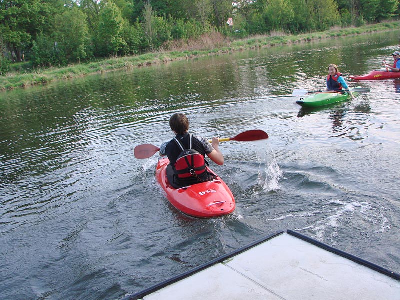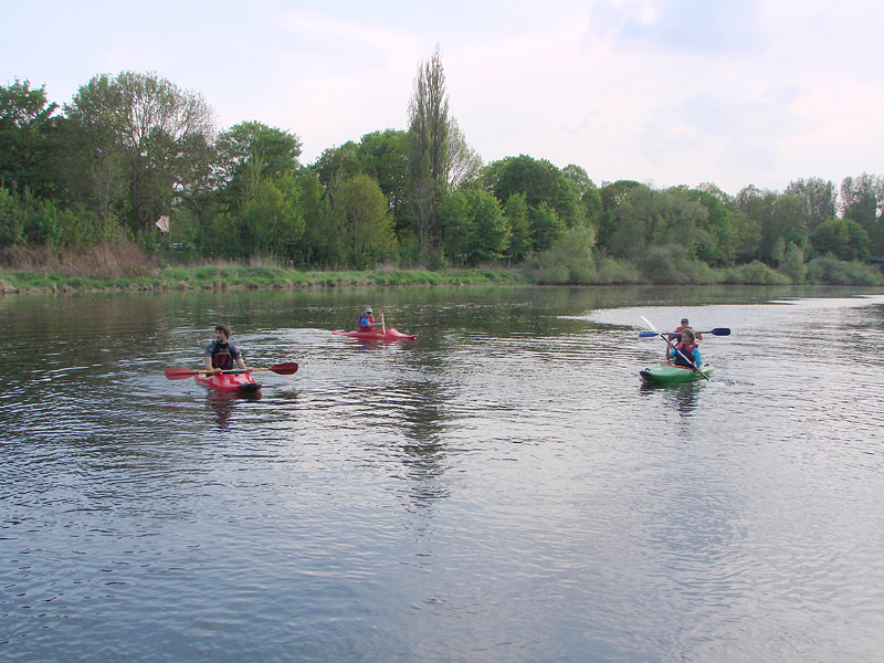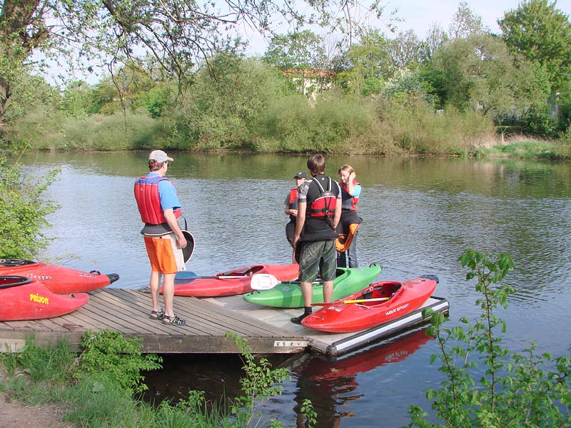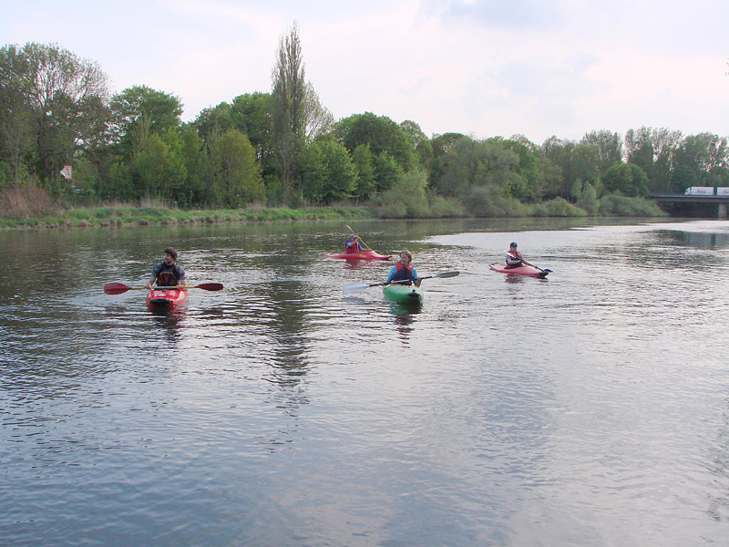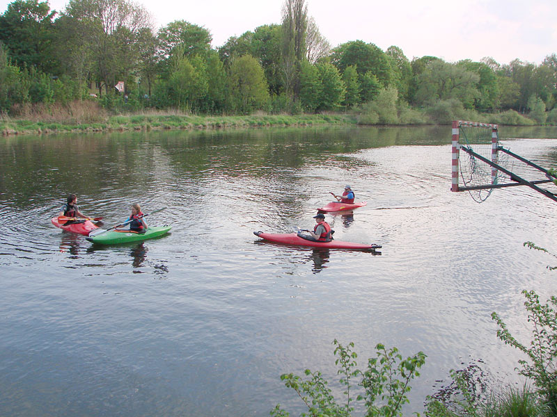 Bei sonnigem Wetter ging es mit 4 fröhlichen Teilnehmern an den Start. Falk hatte den Mut als erster Trainer, sich diesem noch jungfräulichem Projekt zu widmen und tat dies mit vollem Elan. Frei nach dem Motto: "Gerade aus fahren lernt man nur mit WW-Booten", ging es nach einer ordentlichen Einweisung direkt auf's Wasser. Mit fachmännischen Blick und klaren Anweisungen geleitete Falk die Teilnehmer hinauf bis zur Dornröschenbrücke und wieder hinab zur der Brücke, über die die Schnellstraße führt. Natürlich nicht ohne zwischen durch ein paar Stops, Drehen und Wenden zu üben! Auch rückwärtspaddeln blieb den Teilnehmern nicht erspart, denn unter dieser Brücke wurde dies erneut eingesetzt, um im (nicht wirklich beabsichtigten) eirigen Slalom die Brückenpfeiler zu umrunden. Sicherlich mit ganz viel Spaß und einigen harmlosen Kollisionen, doch ohne ernsthafte Kenterungen - dies wird an anderer Stelle geübt! Auf das richtige einsetzen des Paddels, sowie auf korrekte Körperhaltung achtete Falk genauso gut, wie seine Schützlinge frohen Mutes zurück zum Verein zu geleiten.