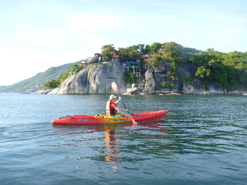 Unser erster Halt war die Insel Koh Panghan (was doppelt gemoppelt ist, weil Koh schon Insel heißt 🙂 im Golf von Siam. Die Äußeren Bedingungen waren schon mal prima. 30° Lufttemperatur, das Wasser klar und fast genauso warm sowie in in geschützten Lagen kein Seegang. Wir wollten dort mal die Halbinsel, an der unser Hotel lag umrunden. Vor der Steilküste, zum offenen Meer hin, sind wir dann aber umgedreht, weil die Sit-on-Top-Badewanne schon bei leichtem Wellengang nicht mehr gut steuerbar war. In die andere Richtung konnte man dann besser paddeln.